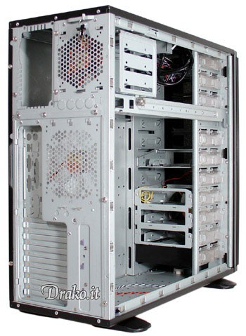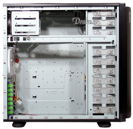 Gli HDD possono essere installati in un apposito "vano", corredato di una notevole ventolona da 120mm che ne assicura il corretto raffreddamento, obbligatorio nel caso di utilizzo di dischi SCSI o con più di 7.200 rpm. Ovviamente anche questo vano è liberamente rilocabile! La dissipazione del calore è affidaca a tre ventole così posizionate: una da 120mm ed una da 92mm sistemate nella parte posteriore del case, in modo da espellere tuto il calore prodotto all'interno dello stesso, ed una 92mm posizionata nella parte superiore del case, per espellere il calore residuo che arriva nella parte superiore del tower. La novità indrotodda con questa serie è l'enorme ventola da 25cm posizionata sul pannello laterale, in grado di fornire un'ottima portata d'aria producento solamente 15 dBA.