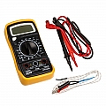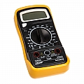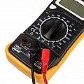 Multimetro digitale portatile con display LCD per la misurazione della tensione DC e AC, corrente DC, resistenza, diodi, transistor, temperatura e test di continuità.