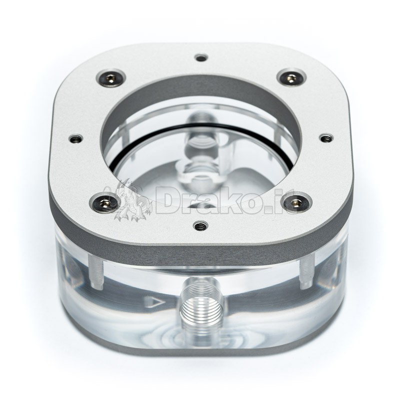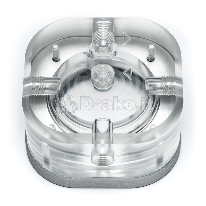 È stata realizzata da un blocco acrilico con una piastra di alluminio e con i suoi canali ottimizzati per il flusso assicura che ci sia sempre abbastanza liquido che scorre attraverso il tuo sistema. Inoltre, è stata prestata attenzione per garantire che la contropressione sia più bassa possibile in modo che la pompa non venga danneggiata.