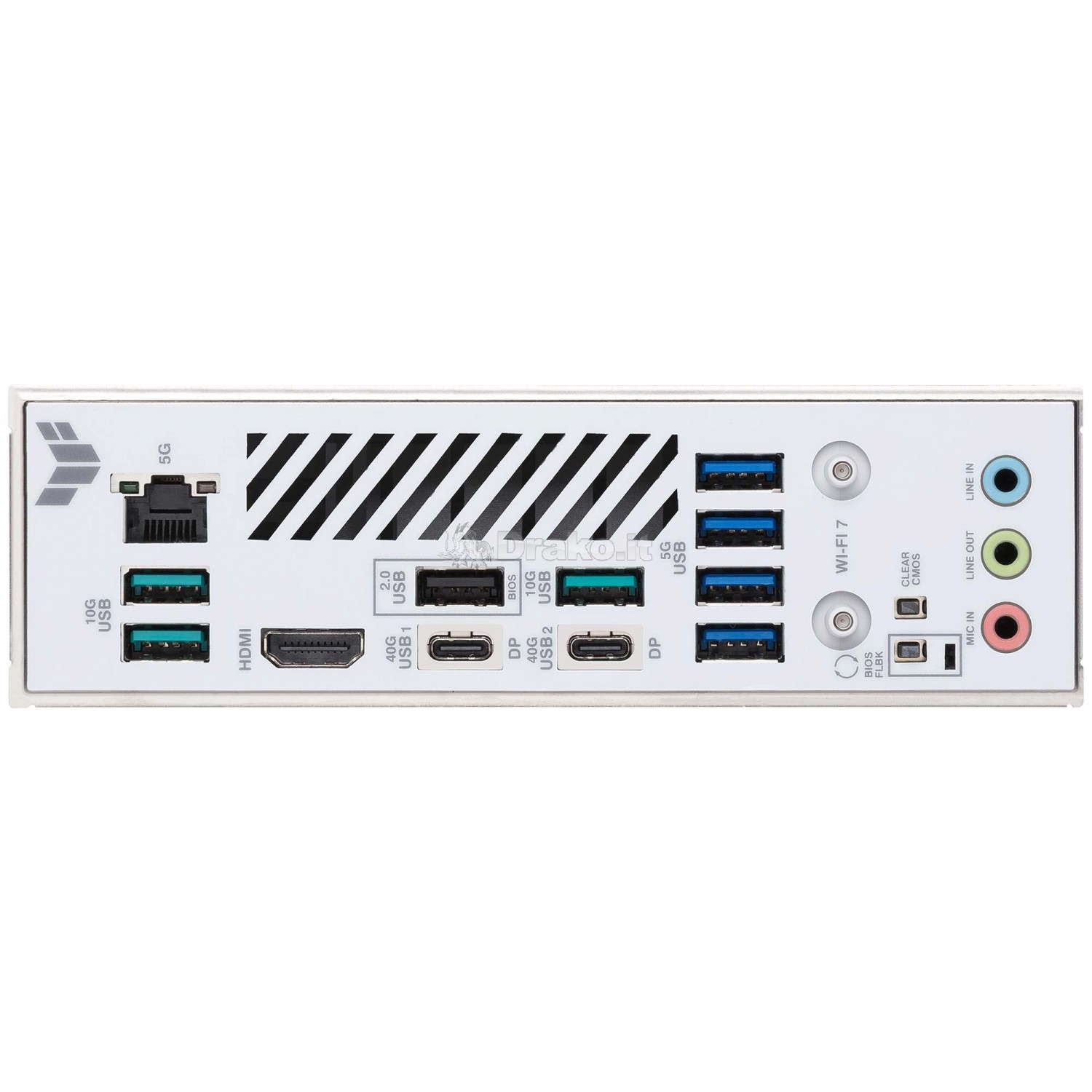 La connettività è di livello professionale: due porte USB4 40Gbps Type-C sul pannello posteriore, tre USB 10Gbps Type-A, quattro USB 5Gbps Type-A, Ethernet Realtek 5Gb (5 volte più veloce del classico 1Gb), WiFi 7 con supporto MLO per connessioni stabili e a bassa latenza anche in wireless, e un header frontale USB 20Gbps con ricarica rapida PD 30W. Il pannello I/O posteriore in acciaio inox è resistente alla corrosione e supera i test di nebbia salina di 72 ore. L'estetica total white è completata da tre header ARGB Gen 2 compatibili con Aura Sync e da tutte le funzionalità Q-Design ASUS per un assemblaggio semplificato.