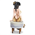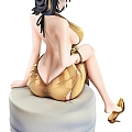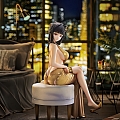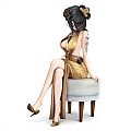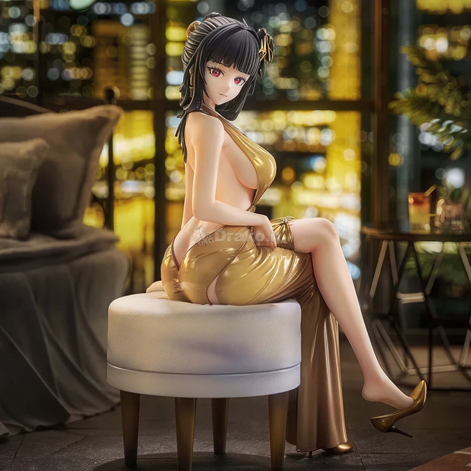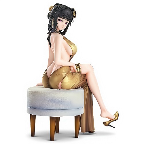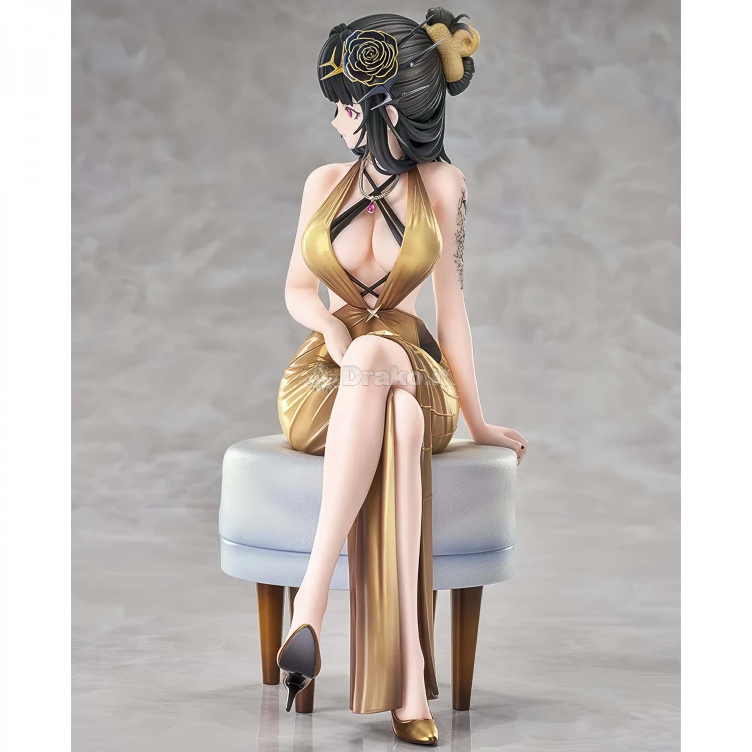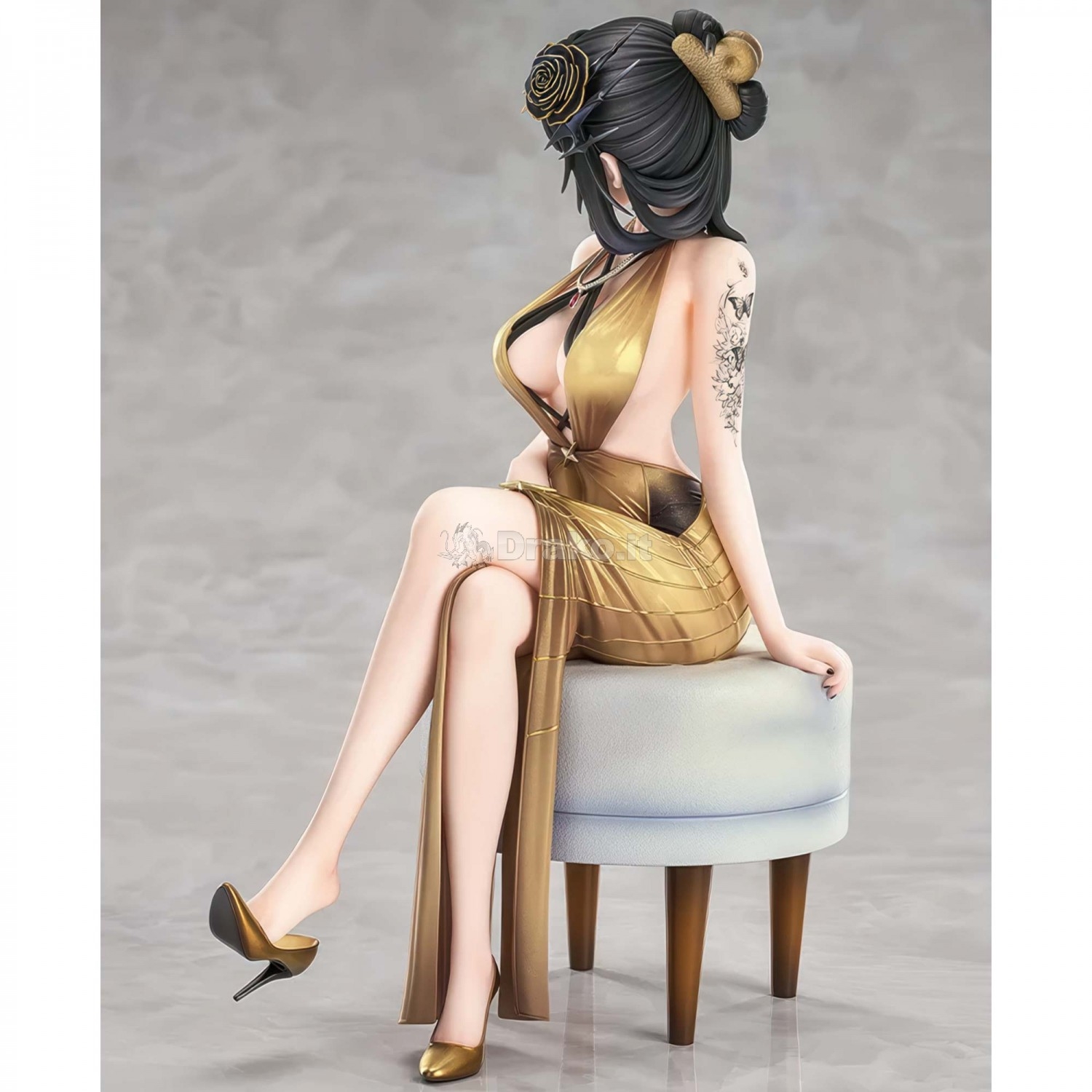 Il personaggio D, membro dell'Elysion's Perilous Siege Squad e protagonista di alcuni dei momenti più memorabili del gioco, viene qui ritratta seduta su uno sgabello imbottito circolare, con le gambe accavallate e il busto leggermente ruotato verso l'osservatore. La texture lussuosa e la lucentezza del suo abito da sera vengono riprodotte con una pittura abilissima che unisce effetti metallici e riflessi glossy simultaneamente. L'abito champagne gold con aperture laterali trasparenti riprende fedelmente il design del gioco, rivelando l'elegante fisicità del personaggio. Ogni dettaglio è stato scolpito meticolosamente: il tatuaggio sul braccio sinistro, il codice a barre nascosto dall'abito, e la scarpa dorata che penzola dalle dita del piede sinistro con una gestualità volutamente casual e spiazzante.