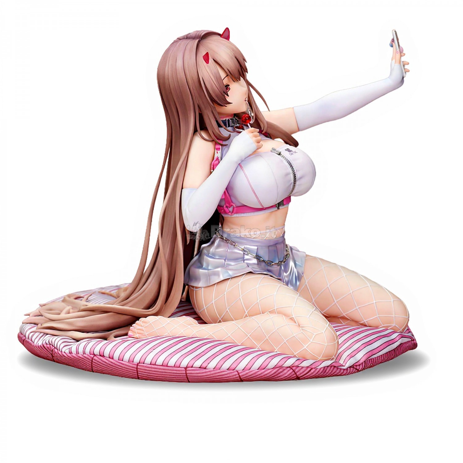 La base della statua è arricchita da un cuscino in tessuto vero, che crea una percezione naturale di peso e morbidezza nella posa seduta, donando all'intera composizione una presenza quasi tangibile. Gli accessori iconici del personaggio, tra cui l'ornamento per capelli a motivo serpente e lo smartphone, sono scolpiti con cura nei minimi dettagli per trasmettere appieno la personalità unica e multisfaccettata di Viper. La scala 1/4 offre a Design Coco una superficie ideale per lavorare su volumi, texture e transizioni di materiali, risultando in una statua percepita come solida, ricca di profondità e protagonista assoluta di qualsiasi vetrina dedicata al collezionismo NIKKE.