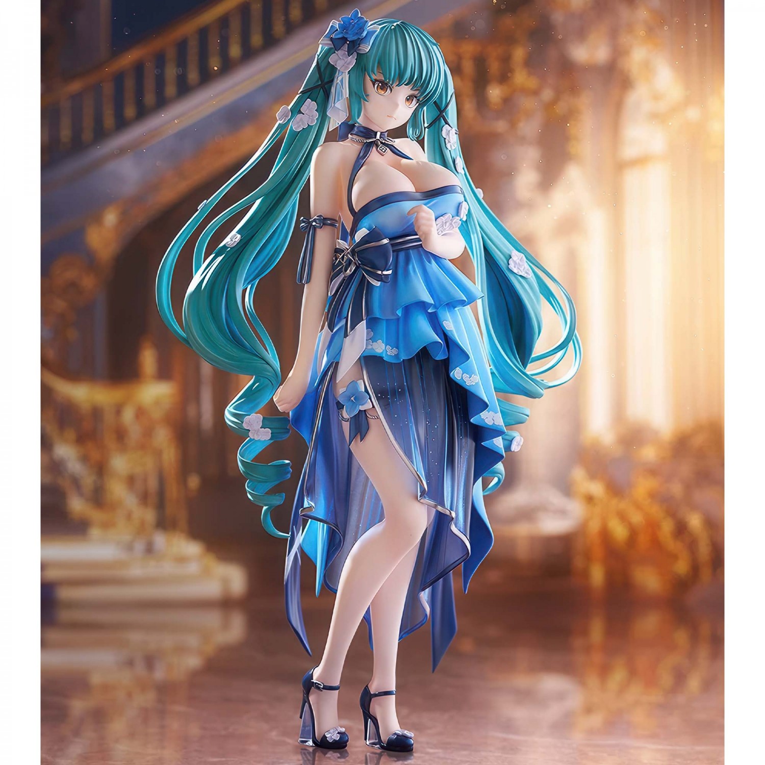 Figura in scala 1/7 di Privaty in costume "Banquet Princess" da NIKKE. Abito da gala con balze elaborate, rifiniture oro e fiori. Scultura Matsuda Model, 240mm, base inclusa.