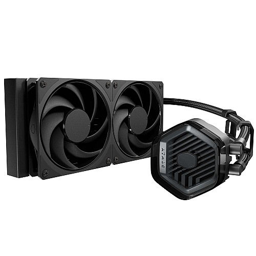 AIO liquid cooler 240mm con dual chamber pump raffinato, 2× ventole Mobius 120 Black pre-installate (2400 RPM, 75.2 CFM, 3.63 mmH₂O), pump cover eco-friendly plastica riciclata con top customizzabile. Loop dynamic bearing >200k hours, radiatore alluminio 277mm, compatibilità Intel LGA1851/AMD AM5. Design all-black stealth no-LED, daisy-chain fans, garanzia 5 anni.