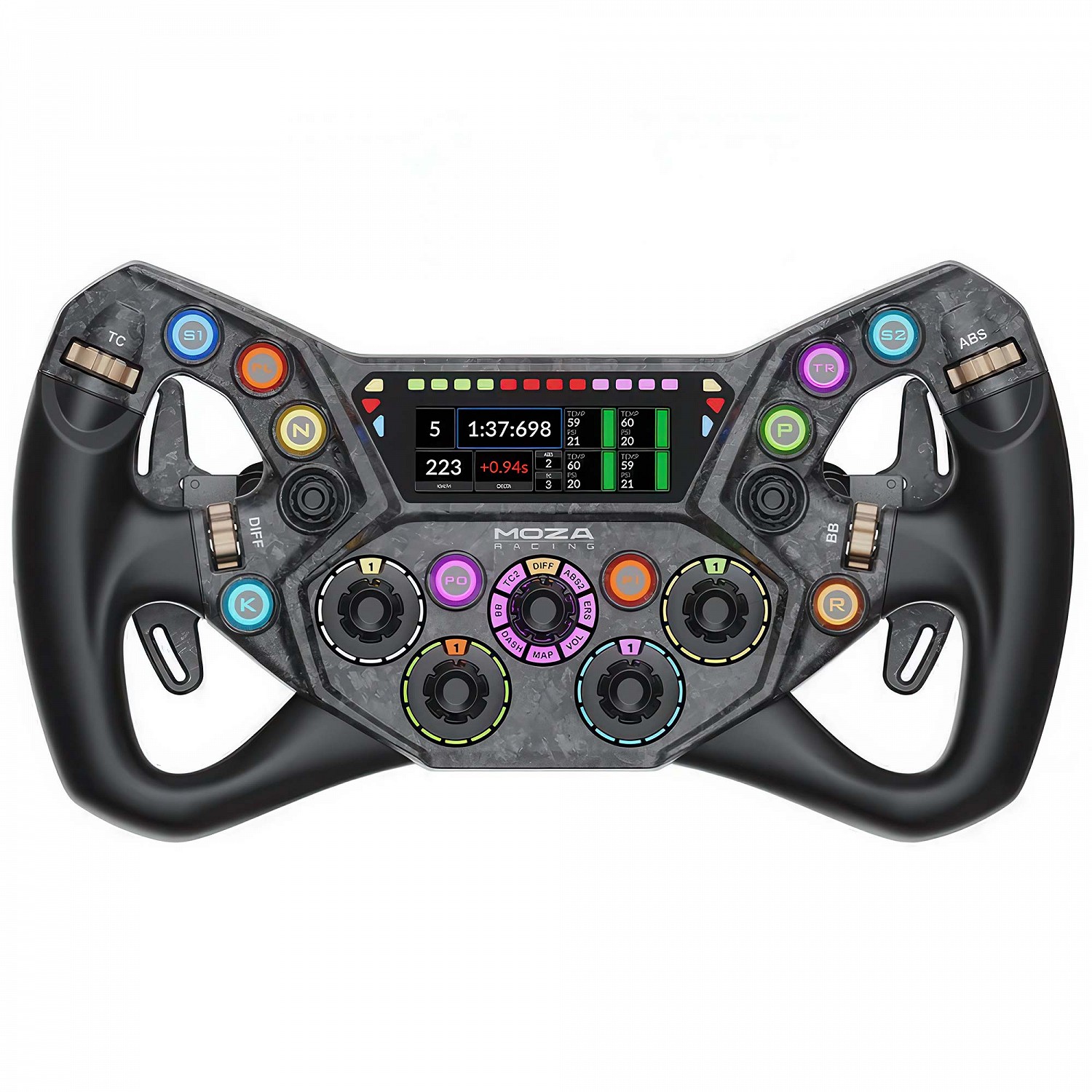 L'illuminazione RGB telemetrica include 12 LED rev superiori, 6 flag laterali e indicatori rotativi multi-posizione, tutti regolabili in 16.7 milioni di colori per feedback visivo in tempo reale. Gli input includono 10 pulsanti RGB backlit, 5 encoder rotativi, 2 thumb encoder, 2 funky switch a 7 vie e 2 pulsanti posteriori, ottimizzati per muscle memory e strategie complesse. Compatibile con basi MOZA e terze parti, enfatizza leggerezza, stabilità e riduzione della fatica.