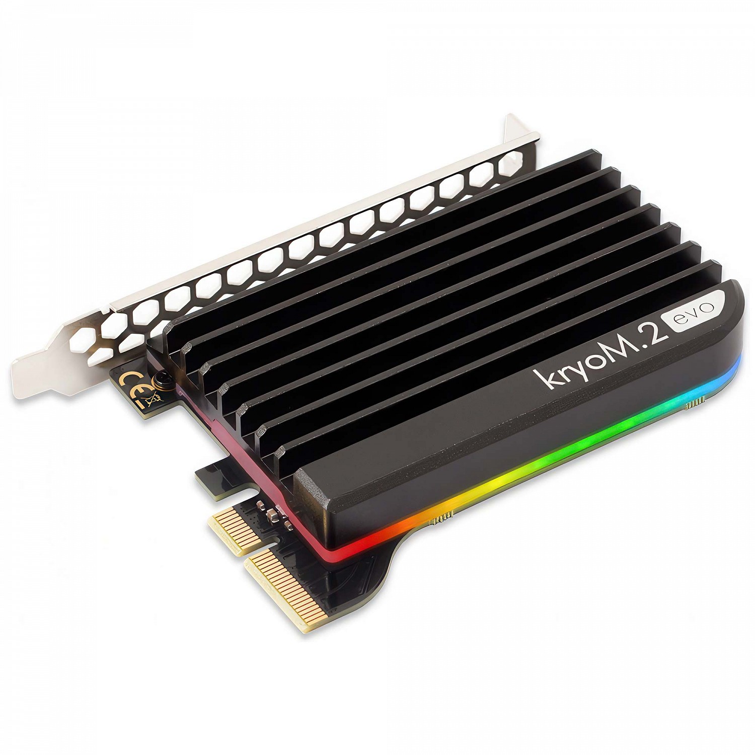 Adattatore PCIe 5.0/4.0/3.0 x4 per SSD M.2 M-Key 2280 con dissipatore passivo full-cover in alluminio eloxato, 17 LED RGB indirizzabili, PCB dorato, tracce impedenza-controllate, connettore RGBpx.