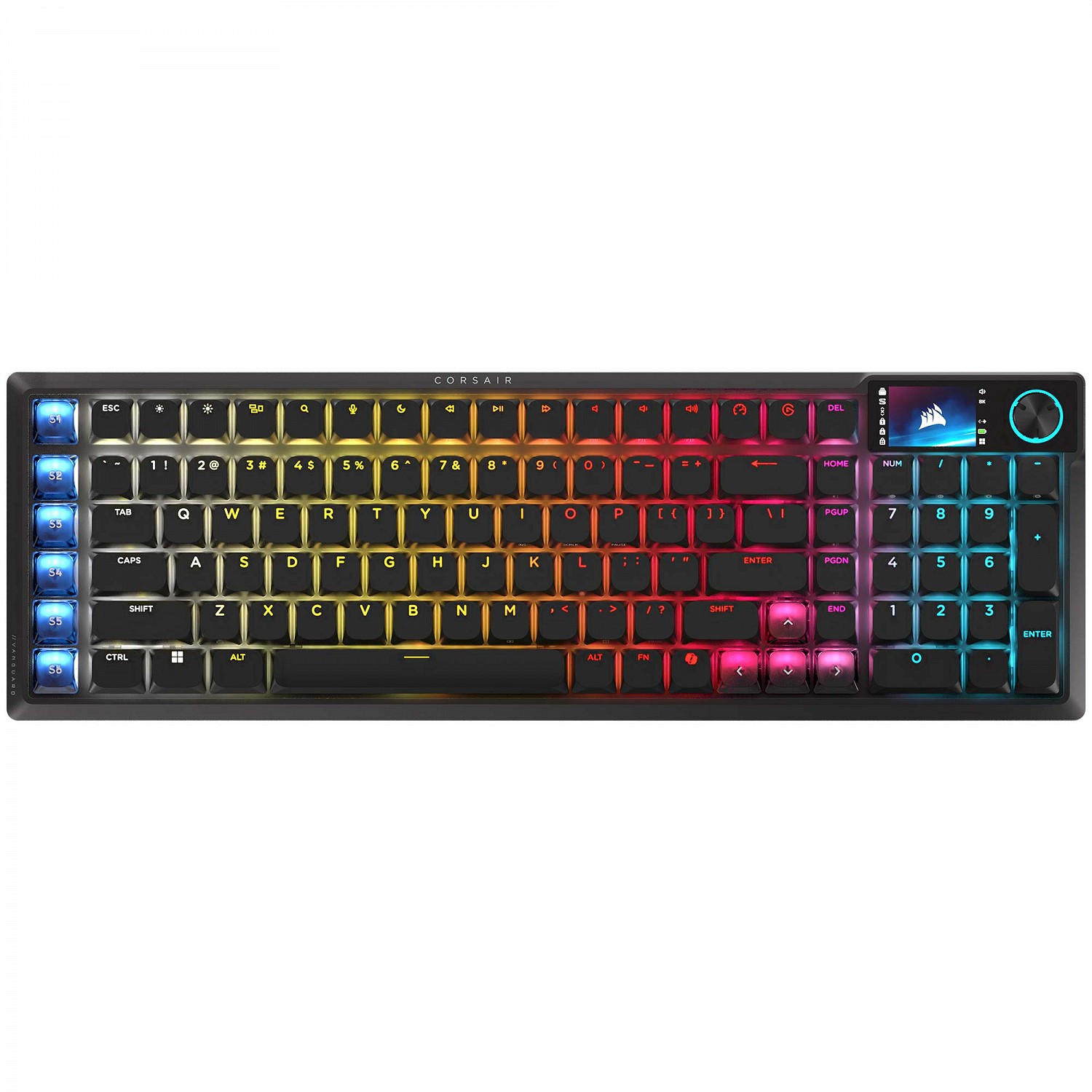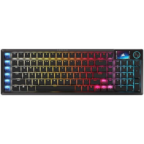 Il pannello superiore integra uno schermo LCD IPS a colori da 1,9 pollici (risoluzione 320 × 170 px, luminanza 350 cd/m²) con manopola multifunzione accanto, posizionati nell'angolo superiore destro della tastiera. Il display mostra GIF animate, immagini statiche o telemetria di sistema in tempo reale — temperatura CPU/GPU, velocità di clock, utilizzo risorse — e può essere configurato tramite software Corsair iCUE accessibile anche via browser senza installazione. La manopola regola volume, luminosità e scorrimento orizzontale/verticale in combinazione con tasti Fn. I 6 tasti SD-key sul fianco sinistro si integrano nativamente con il software Elgato Stream Deck, consentendo l'assegnazione di macro, shortcut applicative, controlli in-game, comandi di streaming e azioni creative con un singolo tocco — più un settimo tasto dedicato all'apertura istantanea del Virtual Stream Deck, pannello di scorciatoie on-screen personalizzabile richiamabile in qualsiasi momento senza alt-tab. La costruzione prevede un gasket mounting premium, pale pre-lubricate e 5 strati di sound dampening interno per un'acustica "thocky" e un feedback di digitazione raffinato. I keycap PBT Doubleshot (versione US) garantiscono resistenza all'abrasione e leggibilità nel tempo. La connettività è tri-modale: 2,4 GHz Slipstream v2, Bluetooth e USB-A cablato. L'autonomia dichiarata è fino a 55 ore (condizioni ottimali: Slipstream, RGB off, display 20%, polling 1.000 Hz); nell'uso reale con RGB e display attivi si attestano 20–30 ore.