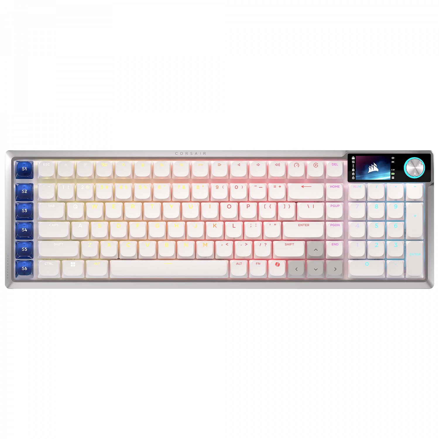 Il pannello superiore integra uno schermo LCD IPS a colori da 1,9 pollici (risoluzione 320 × 170 px, luminanza 350 cd/m²) con manopola multifunzione accanto, posizionati nell'angolo superiore destro della tastiera. Il display mostra GIF animate, immagini statiche o telemetria di sistema in tempo reale — temperatura CPU/GPU, velocità di clock, utilizzo risorse — e può essere configurato tramite software Corsair iCUE accessibile anche via browser senza installazione. La manopola regola volume, luminosità e scorrimento orizzontale/verticale in combinazione con tasti Fn. I 6 tasti SD-key sul fianco sinistro si integrano nativamente con il software Elgato Stream Deck, consentendo l'assegnazione di macro, shortcut applicative, controlli in-game, comandi di streaming e azioni creative con un singolo tocco — più un settimo tasto dedicato all'apertura istantanea del Virtual Stream Deck, pannello di scorciatoie on-screen personalizzabile richiamabile in qualsiasi momento senza alt-tab. La costruzione prevede un gasket mounting premium, pale pre-lubricate e 5 strati di sound dampening interno per un'acustica "thocky" e un feedback di digitazione raffinato. I keycap PBT Doubleshot (versione US) garantiscono resistenza all'abrasione e leggibilità nel tempo. La connettività è tri-modale: 2,4 GHz Slipstream v2, Bluetooth e USB-A cablato. L'autonomia dichiarata è fino a 55 ore (condizioni ottimali: Slipstream, RGB off, display 20%, polling 1.000 Hz); nell'uso reale con RGB e display attivi si attestano 20–30 ore.