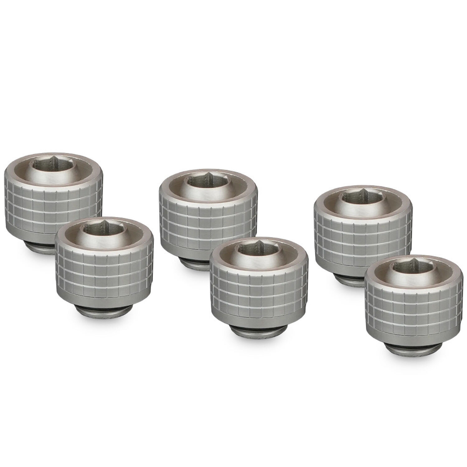 Raccordi compression per circuiti di raffreddamento liquido. Filettatura G1/4", corpo in ottone nichel, design ST16. Pack da 6 pezzi per sistemi custom loop.