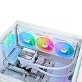 Il modulo ventole adotta un design single-frame che combina tre ventole da 120mm in un'unica struttura, riducendo drasticamente il numero di cavi e semplificando l'installazione. Ogni ventola raggiunge fino a 2500 RPM, con un flusso d'aria di 85.29 CFM e una pressione statica di 3.86 mmH₂O, mantenendo un livello di rumorosità di 37.8 dB-A. L'illuminazione ARGB a 16.8 milioni di colori è sincronizzabile con le principali piattaforme motherboard: ASUS Aura Sync, MSI Mystic Light Sync, GIGABYTE RGB Fusion e ASRock Polychrome tramite header 5V addressable.