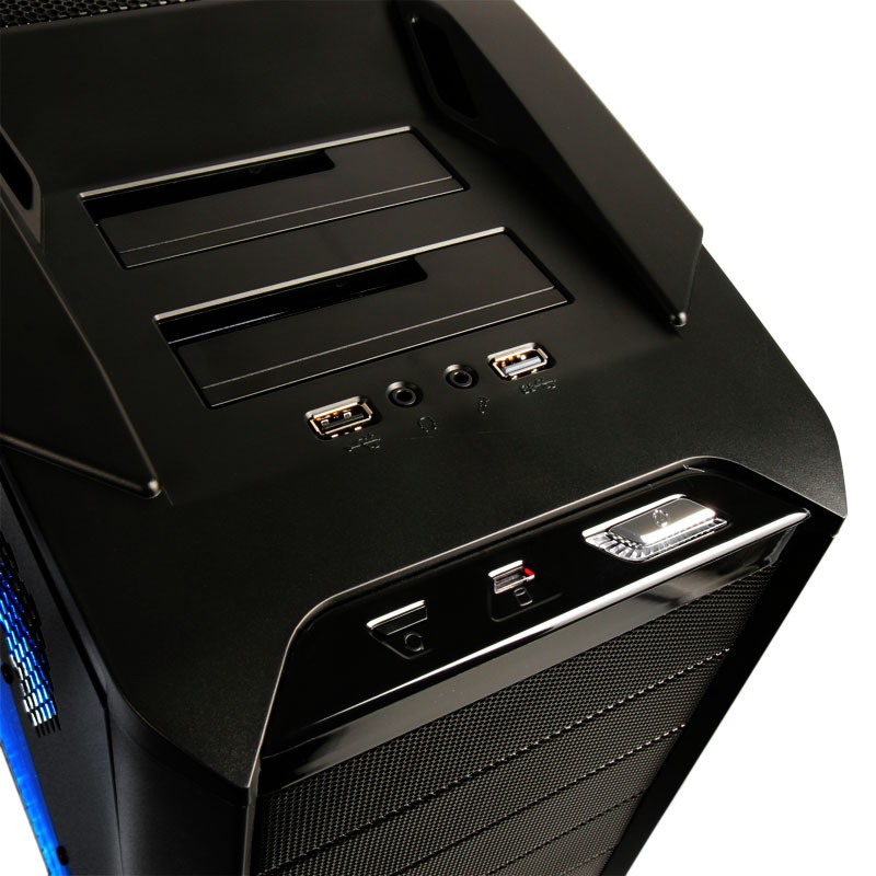 Sul pannello di I/O, sistemato subito sotto i due drive slot, troviamo una doppia porta USB 3.0, le connessioni per cuffia e microfono ed i tasti per Power e Reset. L'ultimo upgrade riguarda la paratia laterale, ora provvista di una generosa finestra laterale in plexyglass con una insolita forma diagonale.