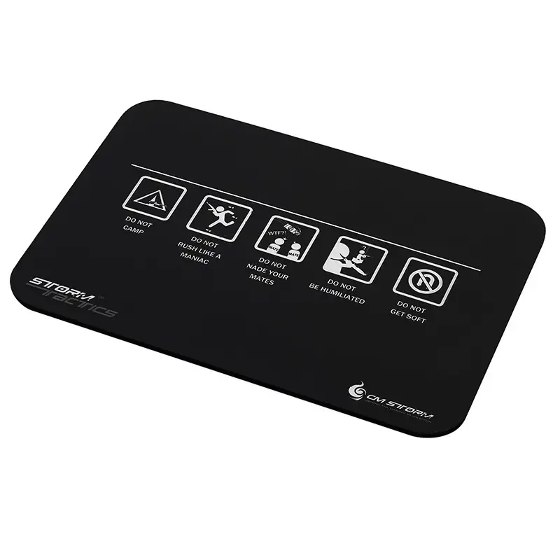 È estremamente noioso quando i giocatori del proprio team o di quello avversario non rispettano le regole di base del gioco on-line. Con questo mouse pad si mettono davanti al naso di qualsiasi gamer che si accinga a giocare le regole d’oro da rispettare, come una maestra che ti dice quello che non devi fare: "Do not camp!", "Do not rush like a maniac!", "Do not nade your mates!", "Do not be humiliated!", "Do not get soft!".